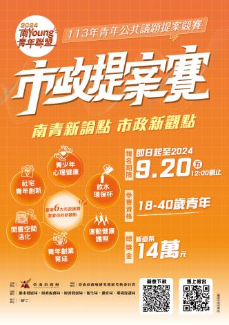 四、即日起開始報名,期限至113年9月20日中午12點止,歡迎年滿18歲至40歲設籍或就學、工作於臺南之國民組隊參加,最高獎金5萬等你來挑戰!