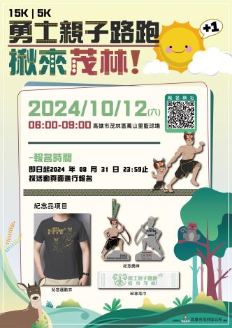 高雄市茂林區擁有豐富的自然生態資源以及獨特的原住民族文化,是一處南台灣的世外桃源;除了每年魯凱族的勇士祭~是非常神聖且重要的文化活動,以及台灣少有的高山吊橋~多納高吊橋,還能聆聽茂林、多納歌謠隊的原住民小朋友吟唱魯凱族古調;來到當地少不了品嚐特有美食。集合上述特點的「2024勇士親子路跑,揪來茂林」是茂林區公所與區民滿滿的誠意,邀請全國家長帶著小朋友一起來玩跑;讓親子交流多一層文化與心靈上的享受。也是讓孩子從行萬里路中,認識共同生長土地上的多元文化。