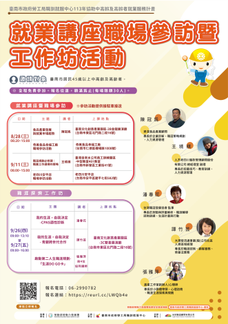 一、為協助轄內中高齡者及高齡者加強就業準備及提升就業技能與職涯規劃,藉由講座課程與職場參訪及工作坊方式,提供相關資訊,以作為其未來求職就業或創業參考,臺南市政府勞工局職訓就服中心將於本(113)年8月28日、9月11日辦理2場講座暨職場參訪(參訪備有交通接駁車)、及9月26日至9月27日辦理職涯探索工作坊,活動全程免費,鼓勵市民朋友參加(詳如附件海報)。