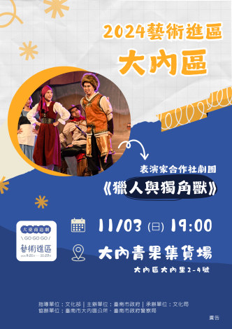 活動訊息:(一)演出單位:表演家合作社劇團。(二)演出節目:獵人與獨角獸。(三)演出時間:113年11月3日(星期日)晚上7時00分。(四)演出地點:大內區青果集貨場(臺南市大內區大內里2-4號)