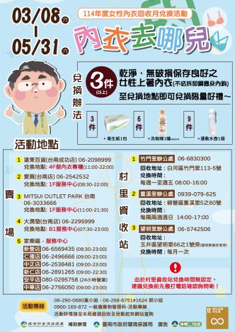 臺南市政府環境保護局辦理「114年度女性內衣回收月兌換活動」,民眾於114年5月31日之前,持3件(含)以上乾淨無破損的女性內衣至指定地點,可兌換環保局宣導品或品牌業者相關優惠。活動訊息詳見活動官網https://gov.tw/cGM