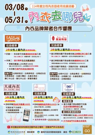 臺南市政府環境保護局辦理「114年度女性內衣回收月兌換活動」,民眾於114年5月31日之前,持3件(含)以上乾淨無破損的女性內衣至指定地點,可兌換環保局宣導品或品牌業者相關優惠。
