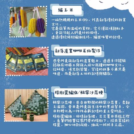 2、文化體驗營、部落市集、打卡抽獎趣。