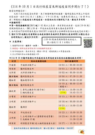 114年10月1日起COVID-19疫苗與流感疫苗同步分2階段開打,實施期程及開放接種對象如下: