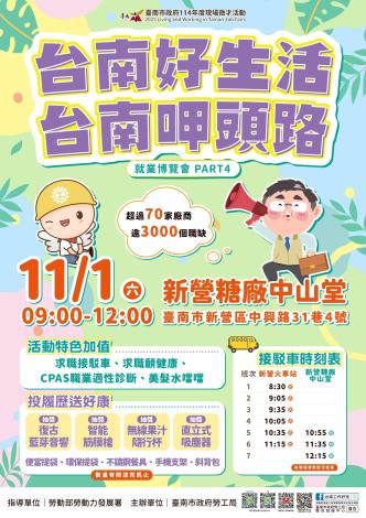 2025「台南好生活 台南呷頭路」第4場大型就業博覽會,將在11月1日(週六)上午9時至12時於新營區新營糖廠中山堂辦理,當日超過70家廠商,提供逾3000個工作機會;活動當天有「投履歷送好康」、「CPAS職業適性診斷」、「履歷健診」、「求職顧健康」、「按摩紓壓」及「美髮水噹噹」等多項免費服務,並可抽直立式吸塵器等好禮,詳洽:06-6330820。