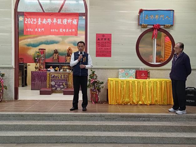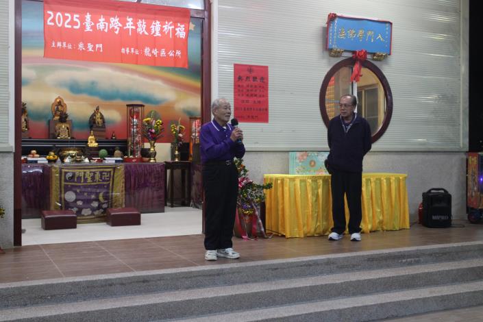 龍崎區為辦理2025臺南跨年敲鐘祈福活動,2024年最後一天12月31日由龍崎區長陳新澈率同民政課長及承辦結合乘聖門林忠義主委及師兄師姐,假乘聖門廟前敲鐘祈福迎新年。