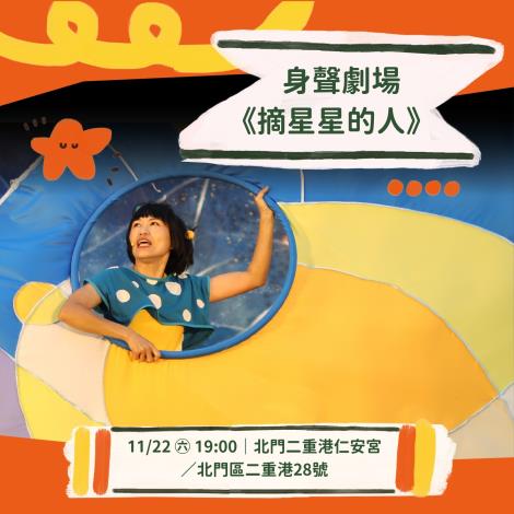 節目活動訊息:(一)演出單位:身聲劇場。(二)演出節目:摘星星的人。(三)演出時間:114年11月22日(星期六)19時00分。(四)演出地點:北門區二重港仁安宮(北門區文山里二重港28號)。